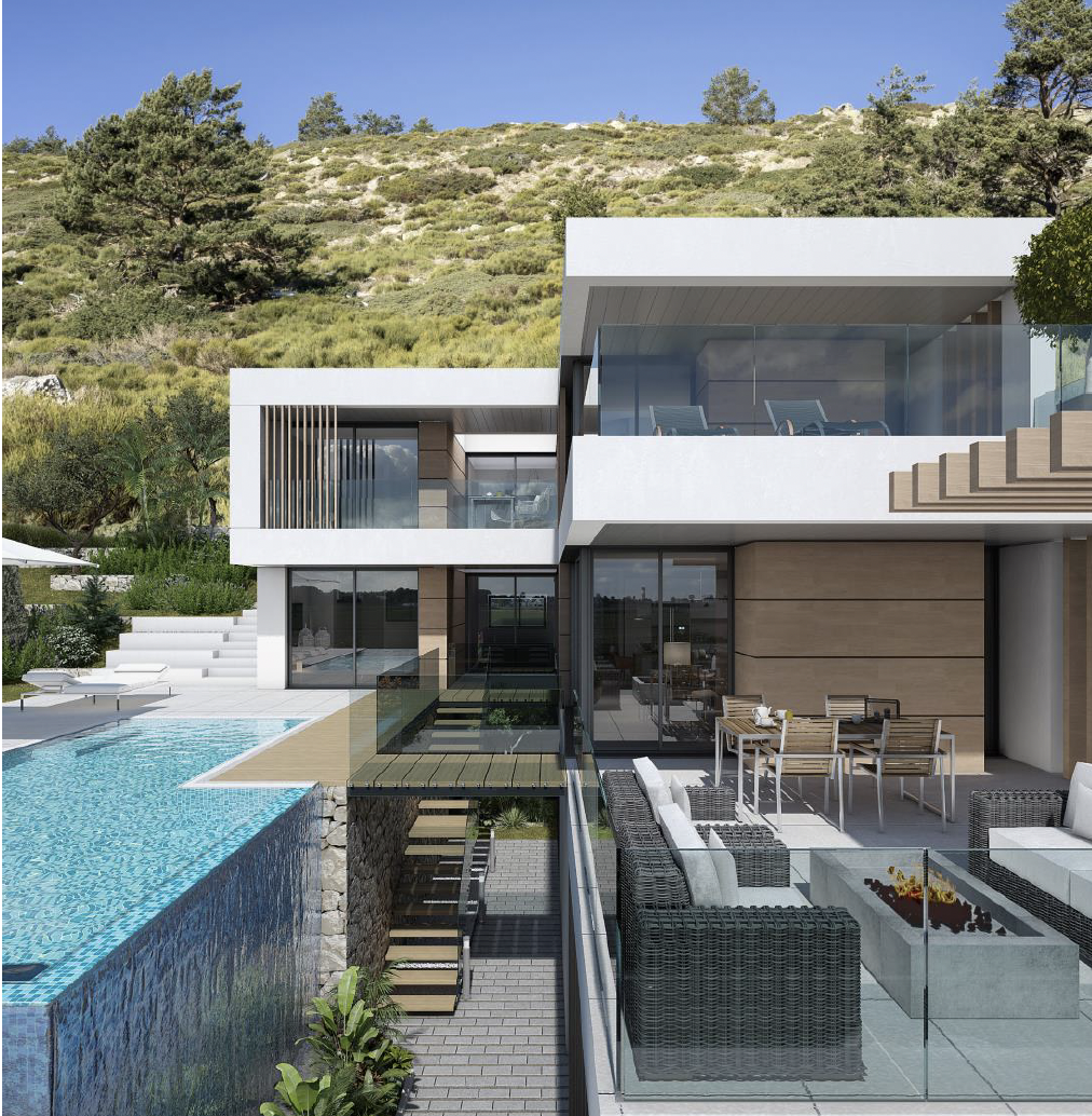 The architectural concept prioritizes integration with the landscape — adapting each villa to the hillside’s natural contours, optimizing sunlight, and preserving panoramic views. This approach creates a sustainable and visually balanced development that blends seamlessly with its surroundings.